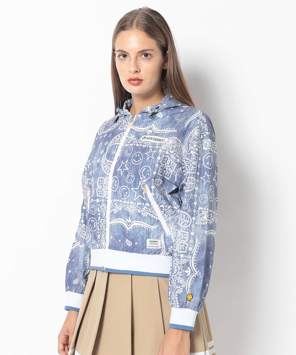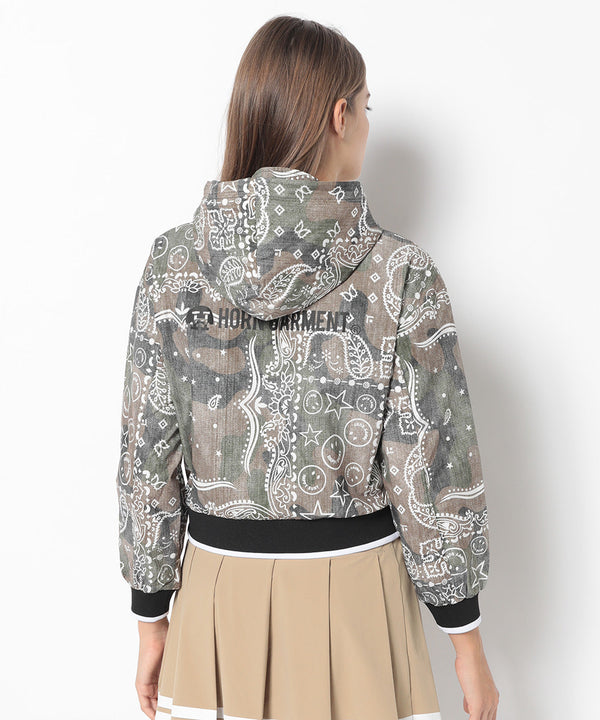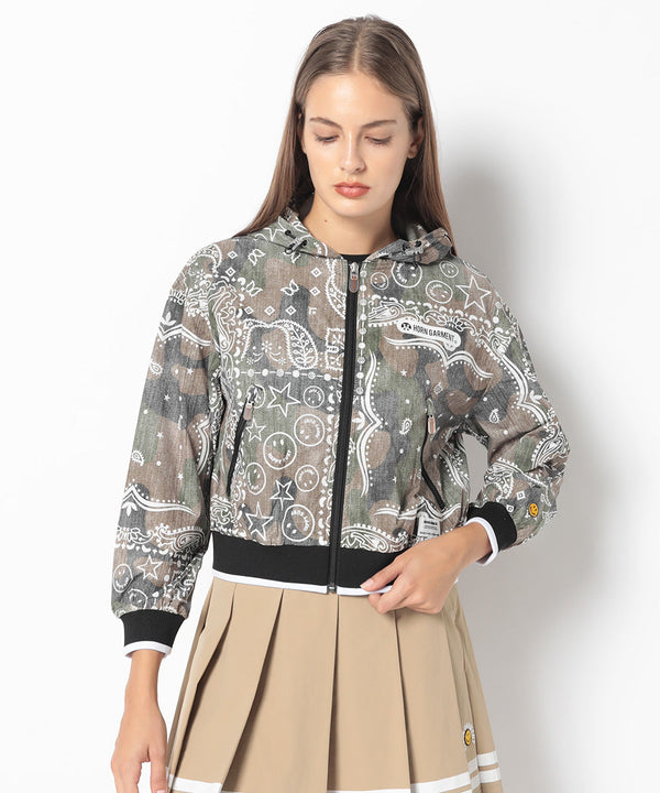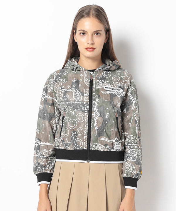 オリジナルペイズリーパターンのフーデットパーカー。肩と身幅にゆとりをもたせたドロップショルダーのリラックスフィットシルエット。マットな風合いが特徴のストレッチタフタにインディゴデニム風とカモフラージュパターンにクレイジーペイズリープリントを施したこだわりのアイテム。一枚仕立てで日差し避けや、軽い防寒等、幅広く活用できます。
