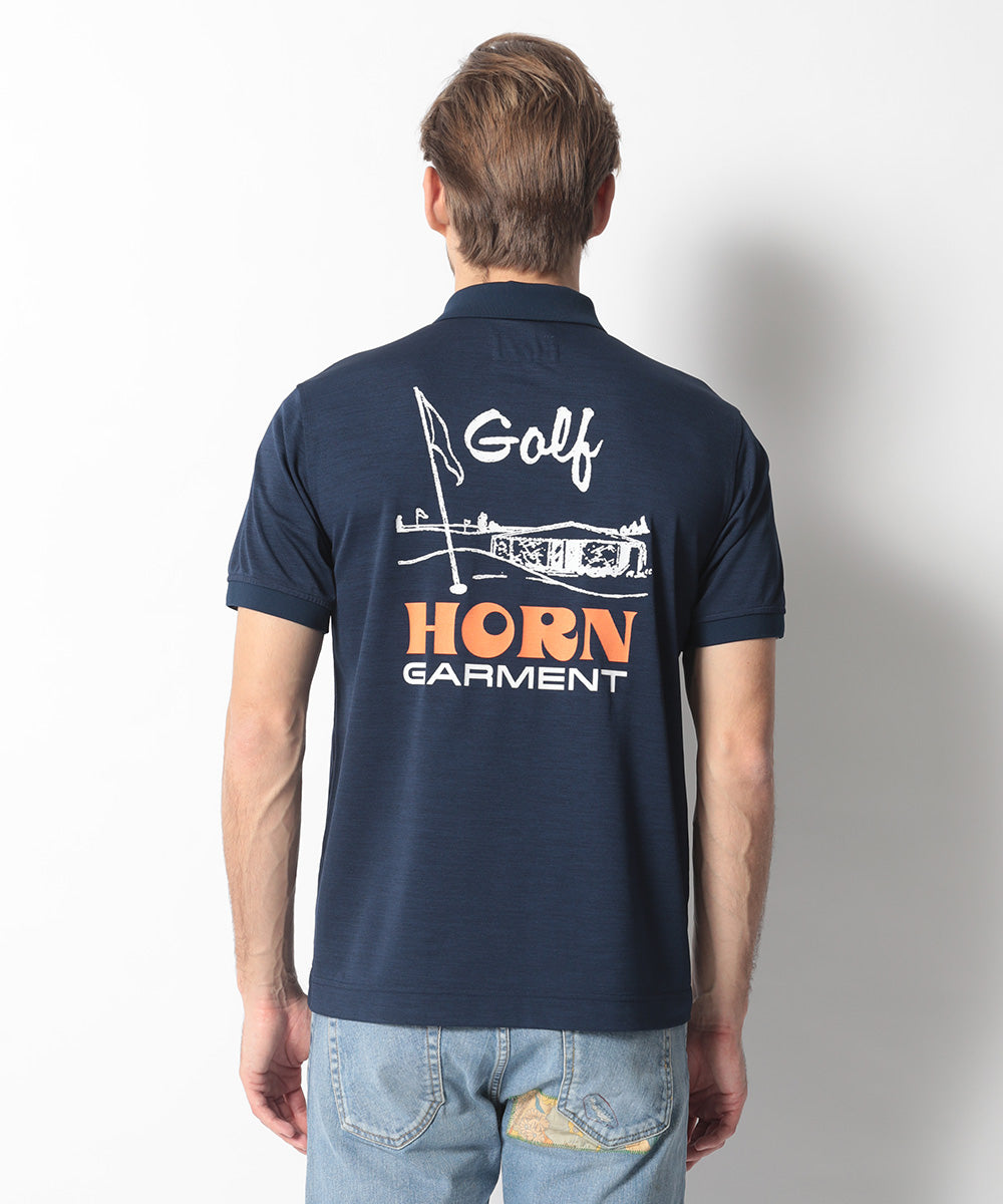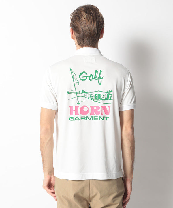 ヴィンテージアメリカンデザインのポケットポロシャツ。右胸ポケットにブランドロゴ刺繍、左胸にヴィンテージフォントデザインのHORN GARMENT GOLFING CLUBのフロッキープリント、バックにヴィンテージアメリカンテイストのゴルフグラフィックプリントを配し、右袖と左脇裾にブランドネームを装着しました。前立てはサングラスホルダーを兼ね備えた定番ディテールを取り入れています。