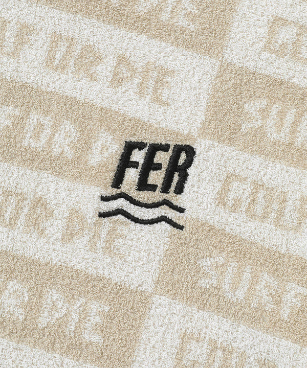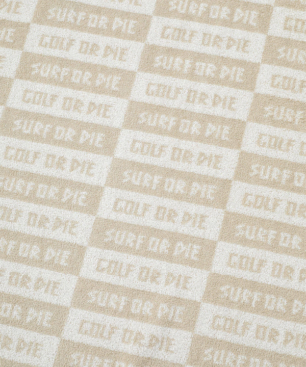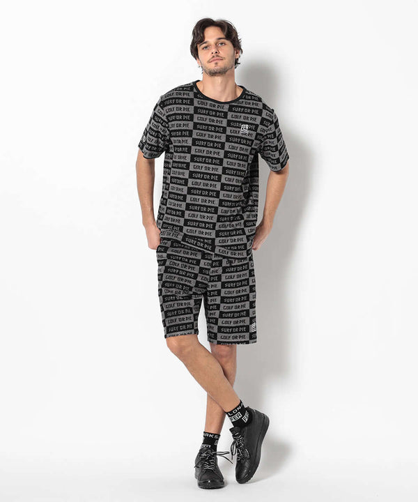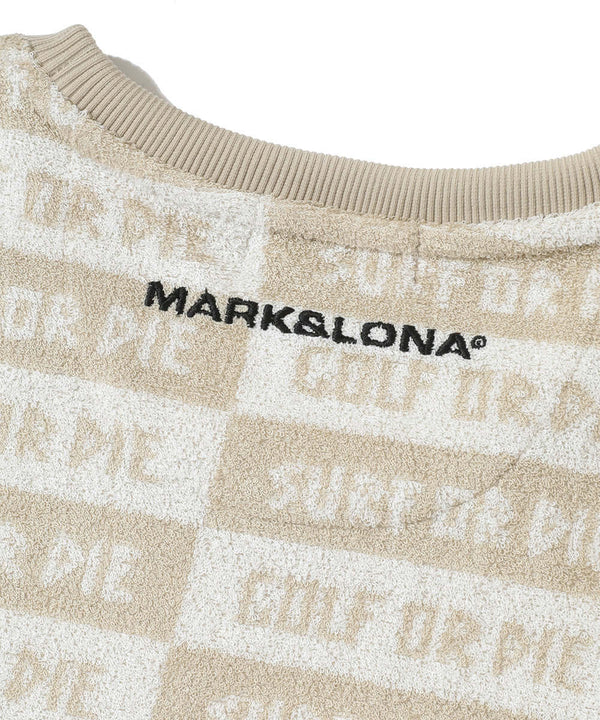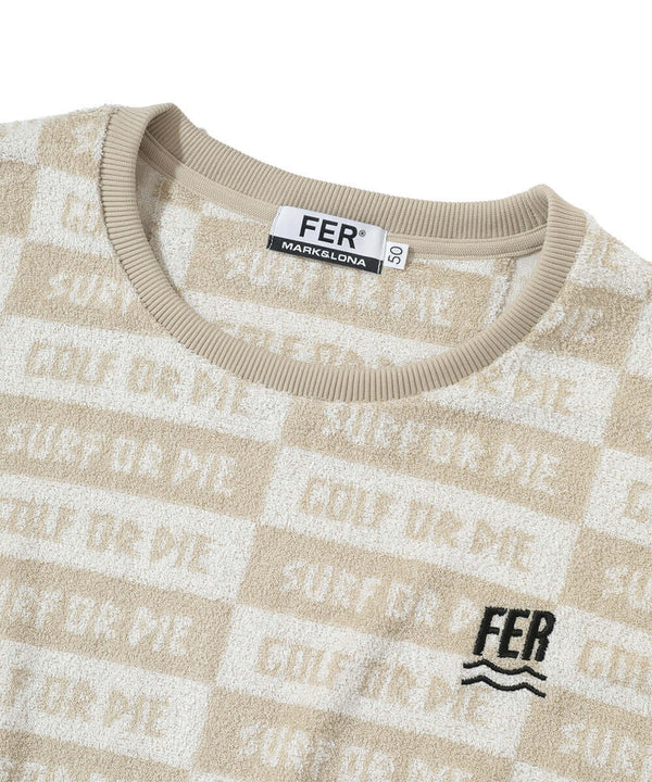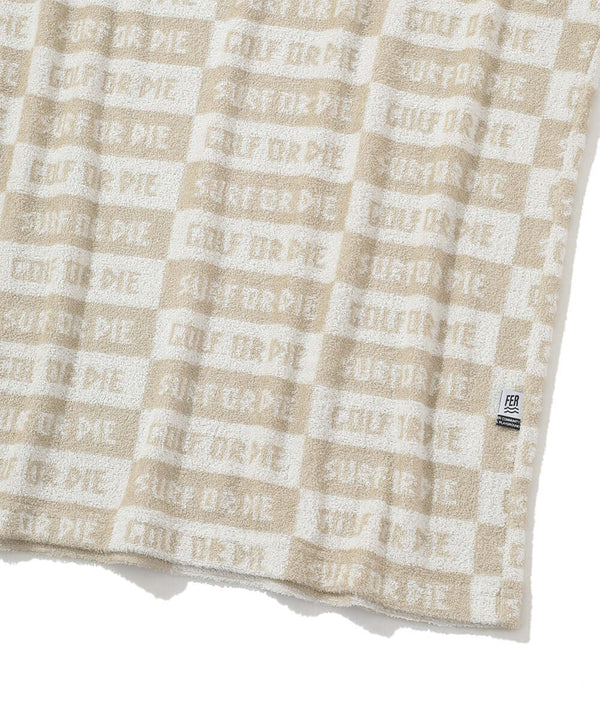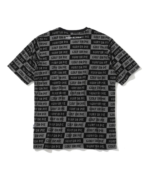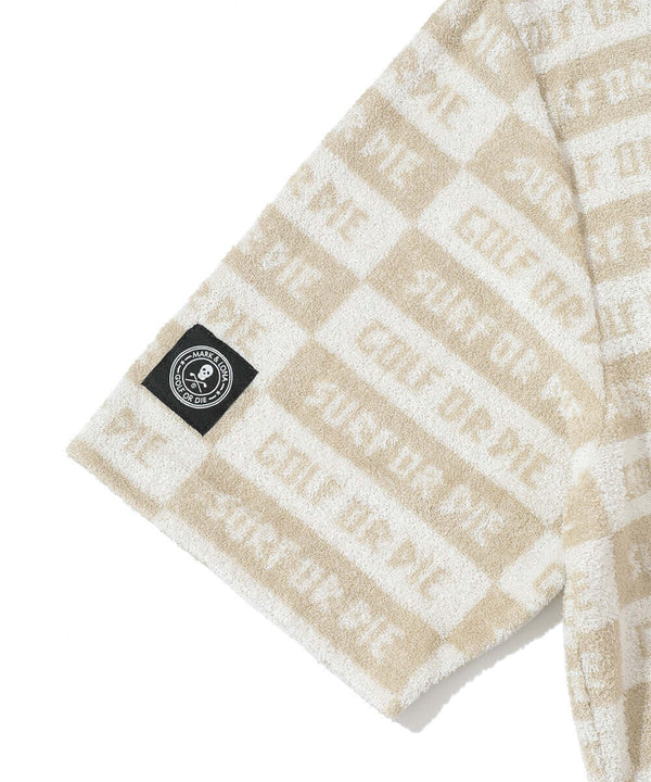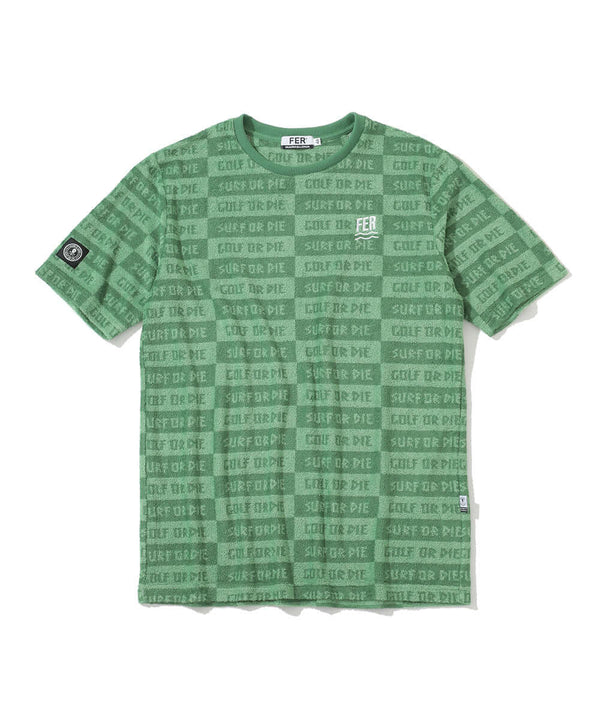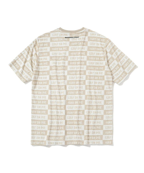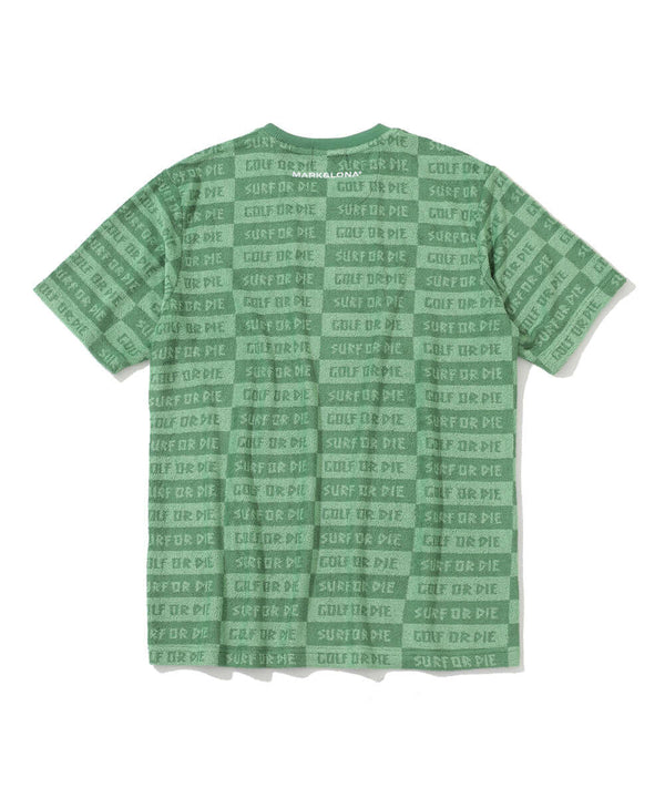 GOLF OR DIE とSURF OR DIEのロゴをブロックパターンのパイルジャカードで表現したTシャツ。表のパイル面をポリエステル、内側をコットンの織組織にすることで、着用時にコットンの吸水性とソフトな肌触りを実感できます。身体の自然なラインに沿ったレギュラーフィットシルエット。同素材を使用したショートパンツ(MFM-5A-AT05)とのコーディネートがオススメです。